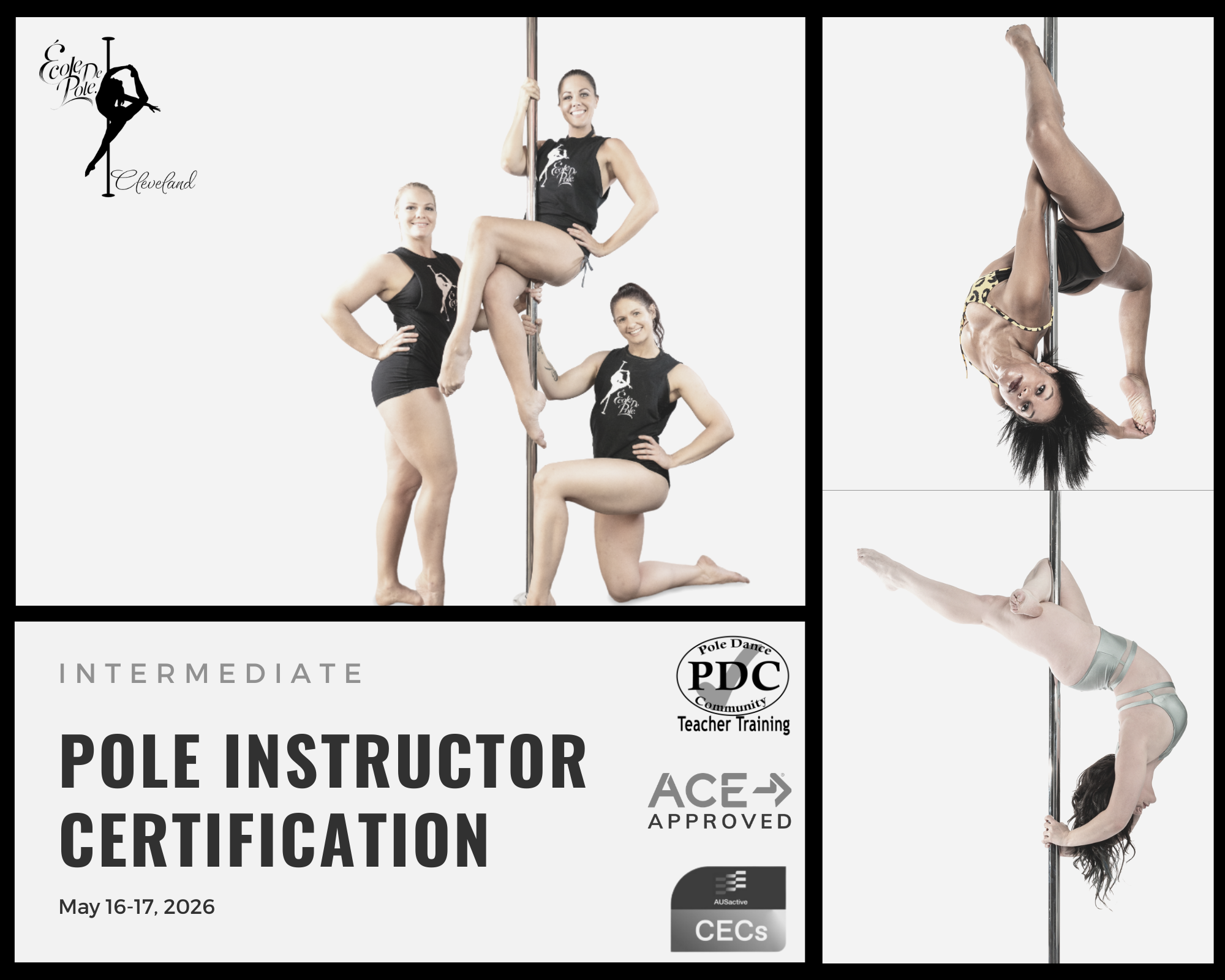 Take your expertise to the next level with Ecole de Pole's Intermediate Instructor accredited training course. Based on functional teaching methodology written by champion poler Justine McLucas, participants will develop a high skill level in Intermediate level technical instruction, pole grips and tricks, ways to correct technique, building strength and flexibility, with an emphasis on safety and injury prevention to support students throughout their pole journey.